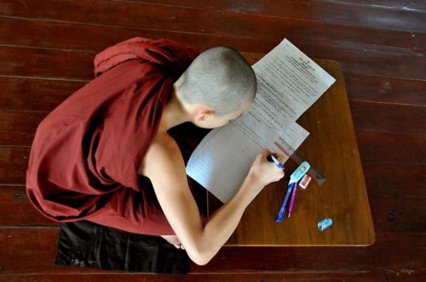 Moine à l’étude dans le monastère bouddhiste de Bago.